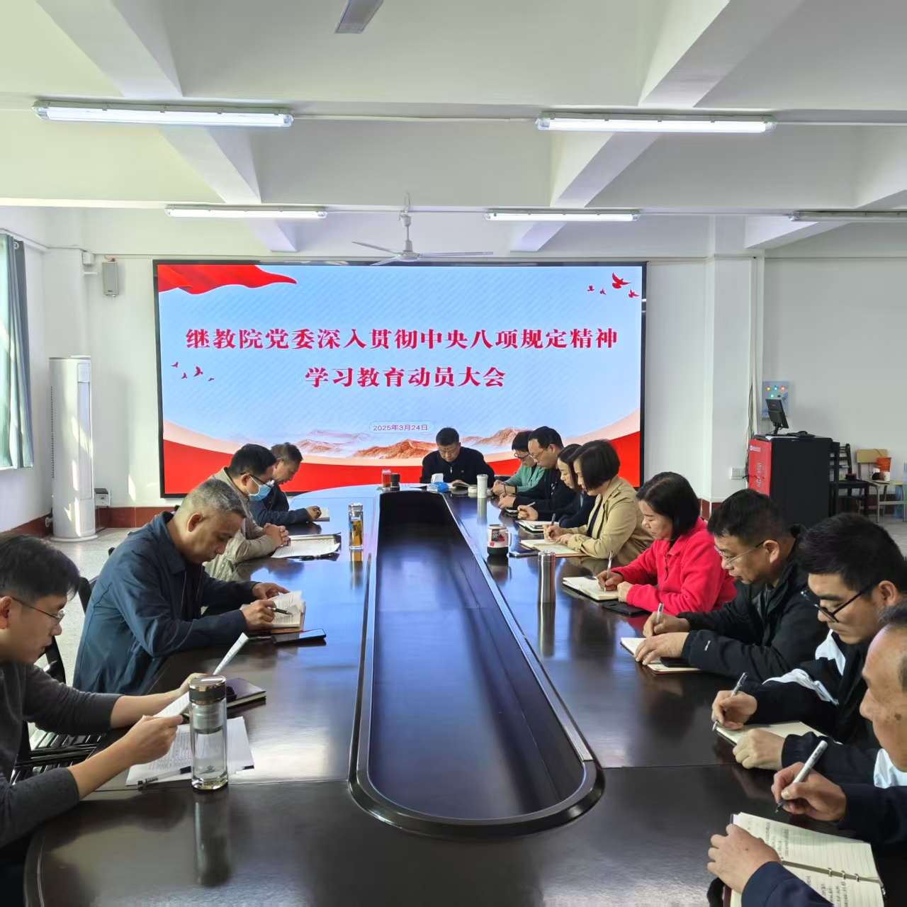3月24日上午,继教院党委在院会议室召开深入贯彻中央八项规定精神学习教育动员大会。会议由党委书记金延安主持,学院班子成员、两个支部全体党员及其他教职工参加会议。